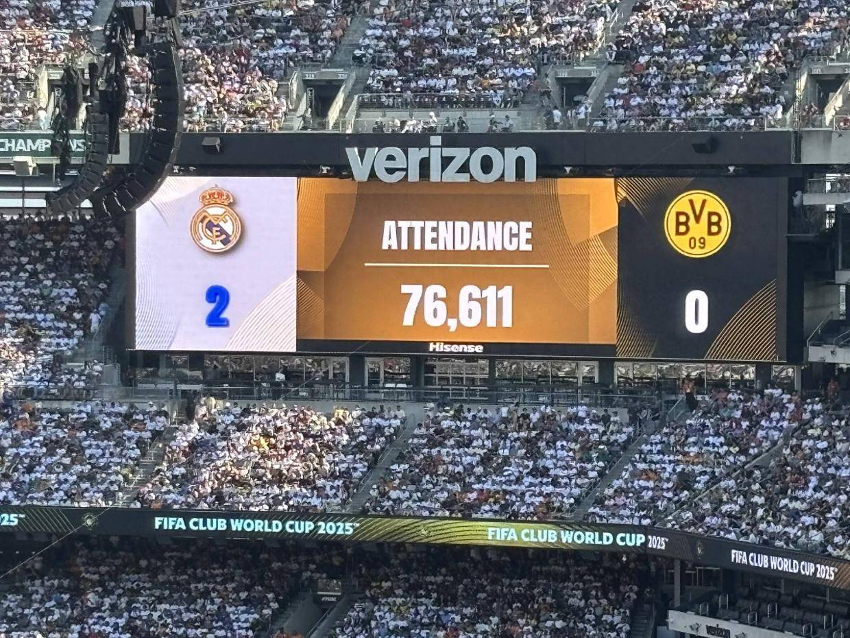 北京时间7月6日凌晨,在最后一场2025世俱杯1/4决赛中,皇马3-2击败了多特蒙德,顺利晋级4强,将在半决赛中对阵新科欧冠冠军大巴黎。在与多特蒙德的1/4决赛中,一共有76611人现场观战,真是座无虚席,世一门的流量在本届世俱杯上得到了充分的证明!