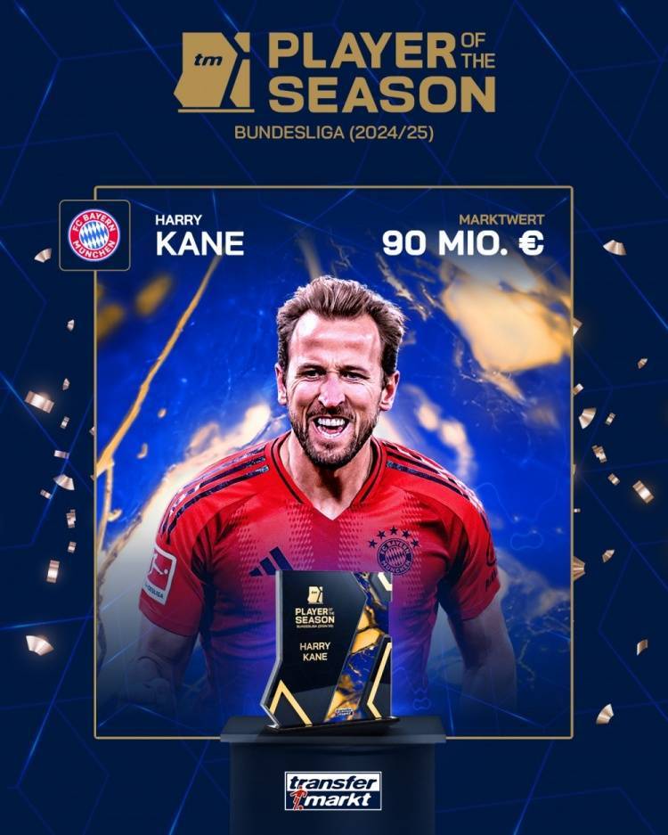 德国转会市场会为全球19个顶级联赛评选最佳球员,凯恩在本赛季德甲投票中获得33.3%的选票,排在他身后的是去年的最佳维尔茨(16.5%)、奥利塞(15.7%)、穆西亚拉(8.6%)和吉拉西(8%)。