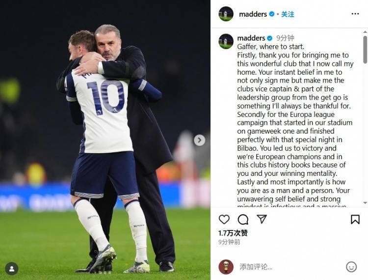 直播吧6月7日讯 热刺中场麦迪逊今天在Instagram发文,告别主帅波斯特科格鲁。